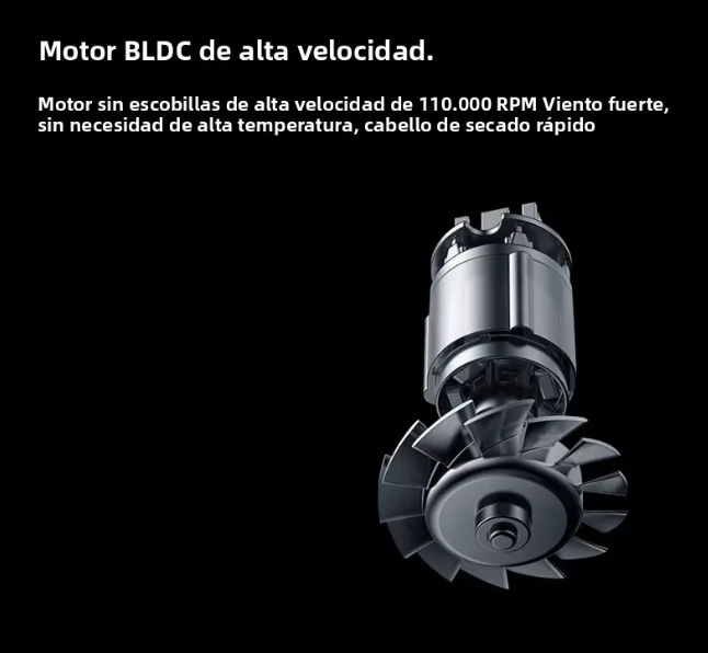 El pequeño y potente motor gira a un máximo de 110 000 rpm. Genera un flujo de aire controlado de alta presión y alta velocidad para un secador rápido.
